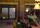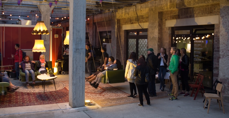 Projektion von ineinander verlaufenden Tapetenmustern für die Installation "Das fliegende Wohnzimmer - Eine Installation zum Abhängen", ausgestellt bei der Veranstaltung "Schwein gehabt" auf dem Gelände des Alten Schlachthofs Karlsruhe
