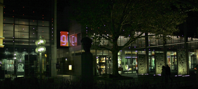 Die Medienfassade, die anlässlich der Ausstellung 'Moving Types - Lettern in Bewegung' am Gutenberg-Museum in Mainz installiert wurde, ist eine interaktive LED-Installation, die sich über die gesamte Breite des Gebäudes erstreckt und von Besuchern per SMS mitgestaltet werden kann.